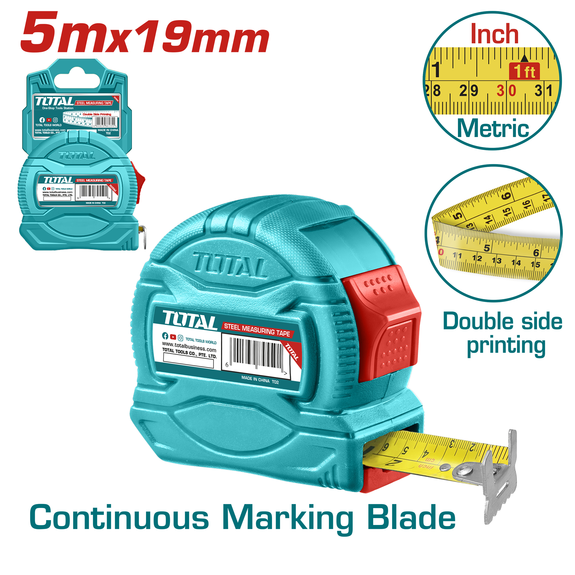 Length & width:5mx19mm One button With metric and inch Pure ABS material cover Packed by plastic hanger